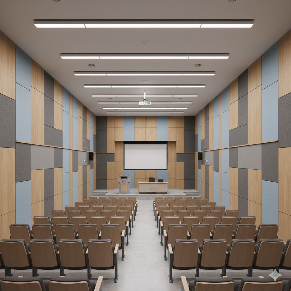 Типичный сценарий: аудитория визуально выглядит законченной, но на занятии слышно эхо, согласные «съедаются», а любой шорох (перекладывание тетрадей, шаги, вентиляция) мешает речи. Причина почти всегда в избытке отражающих поверхностей: окрашенные стены, стекло, плотные двери, плитка, ламинированные панели — всё это возвращает звук обратно в зал. На длинных помещениях и амфитеатрах эффект усиливается: ранние отражения накладываются на речь, и разборчивость падает именно там, где сидят «дальние» слушатели.