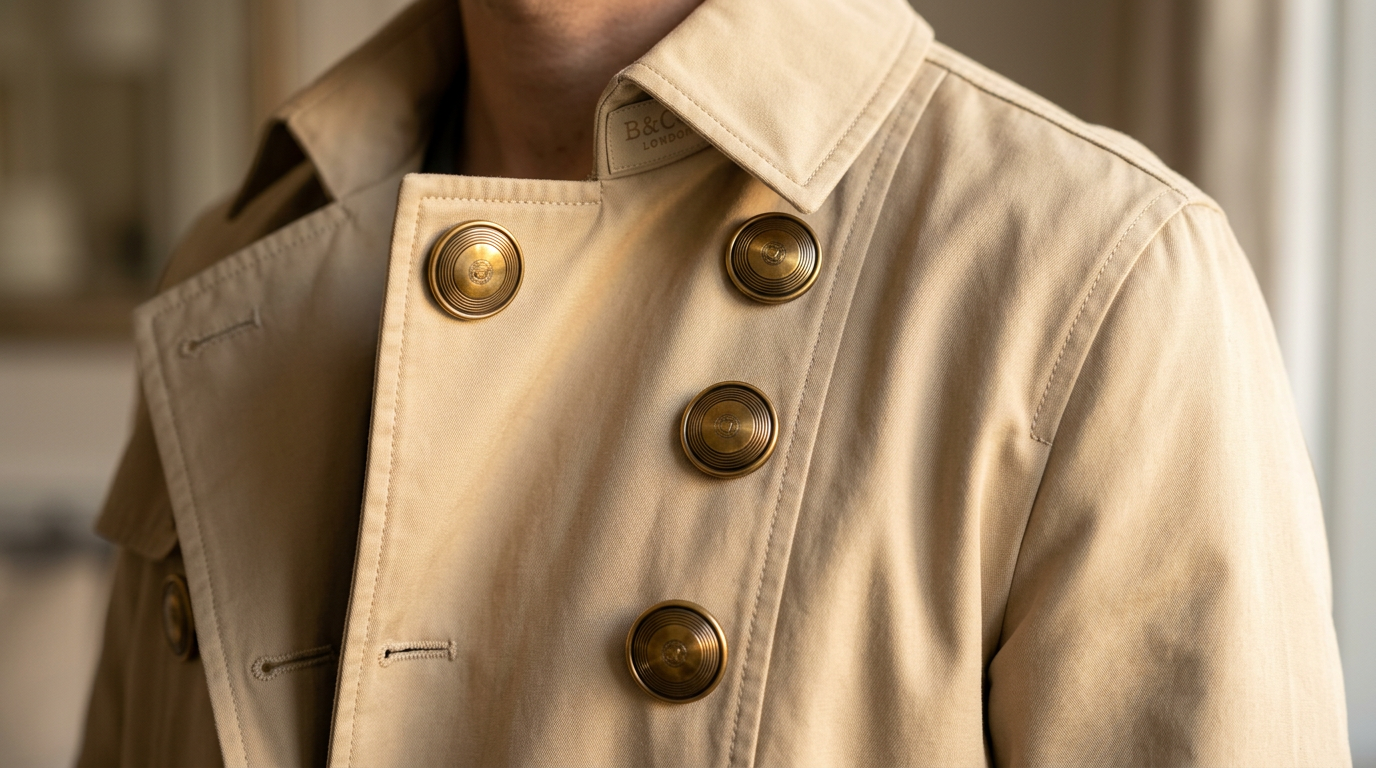 - Контраст с тканью: темные пуговицы на светлом пальто усиливают глубину.